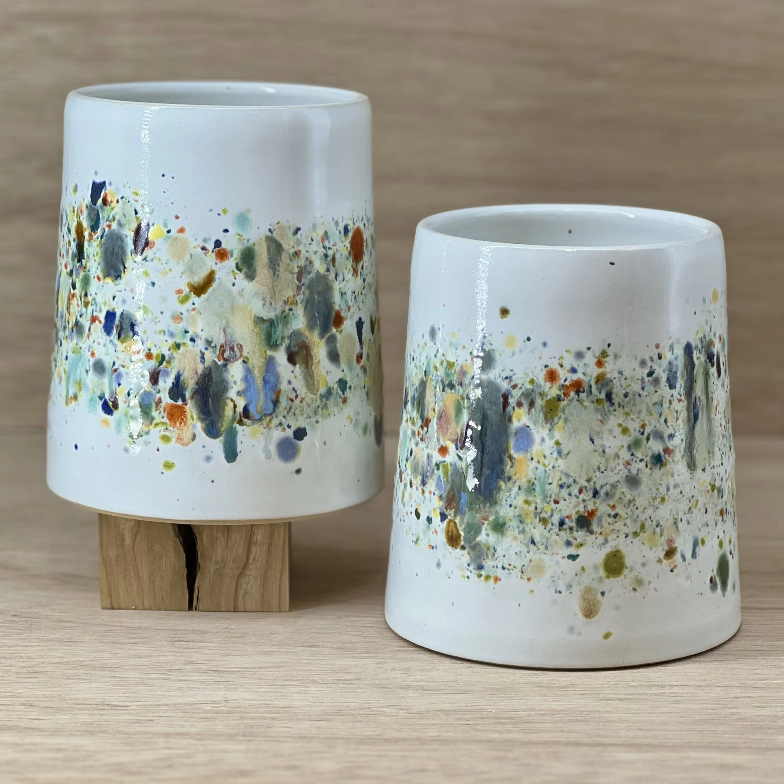 This stoneware planter gets its confetti design from recycled glaze chips created from the artist's other taped design. Each one get a sprinkle of chips on the still-damp white glaze, creating a confetti pattern unique to each piece but still united by a common color palette. Their playful use of color makes it a perfect gift for a variety of home designs.